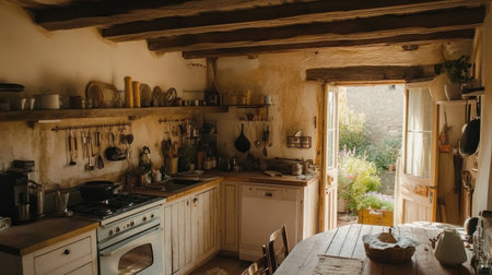 A warm and inviting rustic kitchen featuring charming wooden beams, an open doorway leading to a garden, and a cozy wooden table perfect for culinary endeavors.