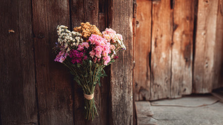 A charming bouquet of colorful dried flowers adds warmth and a rustic appeal, beautifully contrasting with the weathered wooden wall in this serene and inviting setting.