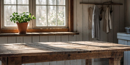 Empty wooden table in front of rural kitchen background. product display concept
