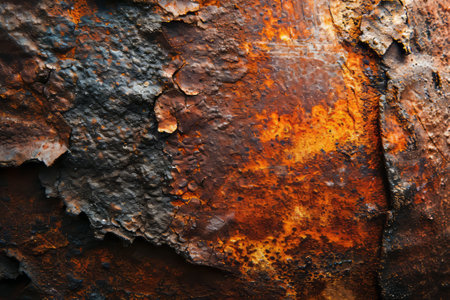 A closeup view of a distressed metal surface that showcases vivid rust formations and unique texture details. Generative AI
