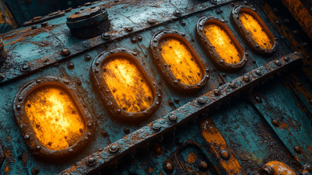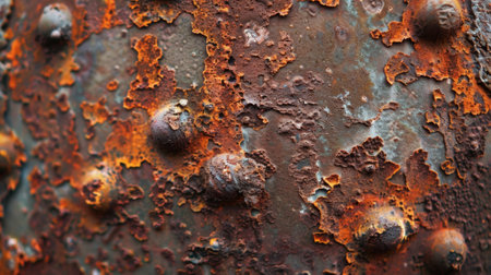 An old weathered metal surface with peeling paint, rust stains, scratches, textures. Grunge detail ideal for backgrounds, design elements, vintage industrial concepts. Metallic surface and rivets.