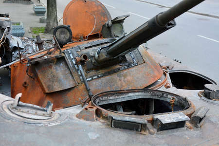 KYIV, UKRAINE - MAY 02, 2022: Tower a destroyed Russian tank, it was destroyed by the Ukrainian military in the Kiev region. Russia invaded Ukraine on February 24, 2022