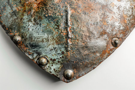 Aged metal shield close up.