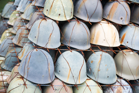 Pile of battered military helmets by old truck remnants of forgotten wars