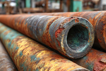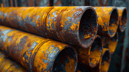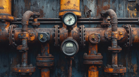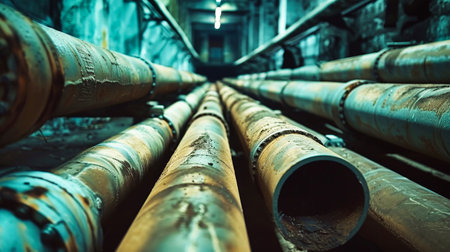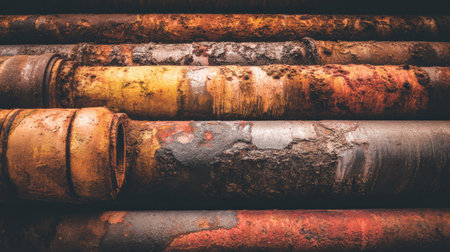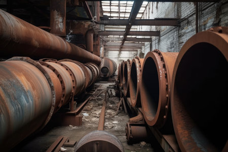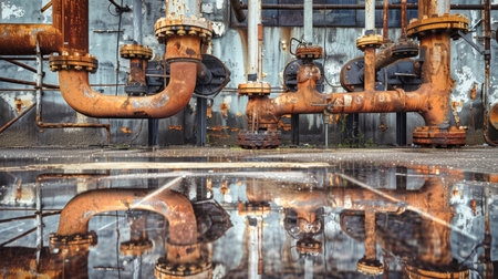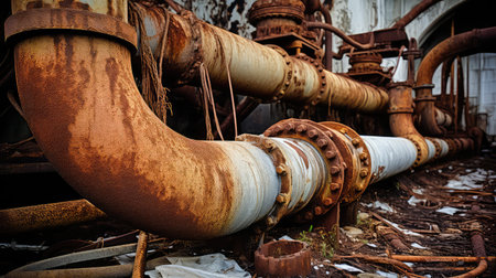 Weathered pipes display rust and decay in an industrial setting. Generative AI