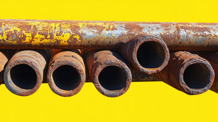 This image showcases a series of rusty metal pipes arranged horizontally against a vibrant yellow background. The close-up perspective highlights the varying textures and openings of the pipes, evoking a sense of industrial history and wear. Perfect for illustrating construction and engineering themes.