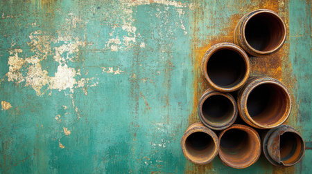 A captivating image featuring a group of abandoned rusty pipes against a textured green wall. The distressed finish adds character, making it ideal for industrial-themed projects.