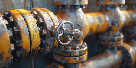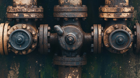 Close-up image of a rusty industrial valve on aged metal pipes, showcasing unique textures and vibrant colors. Perfect for themes of industry and machinery.