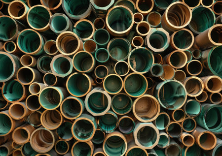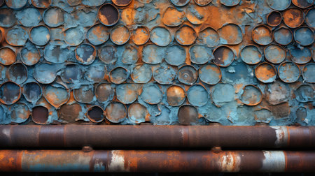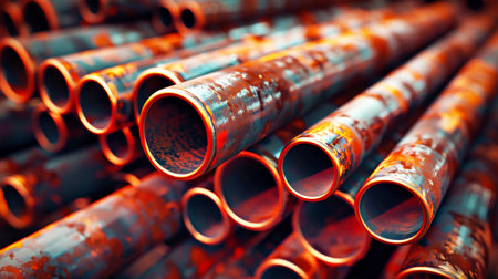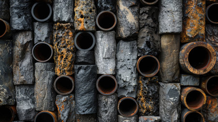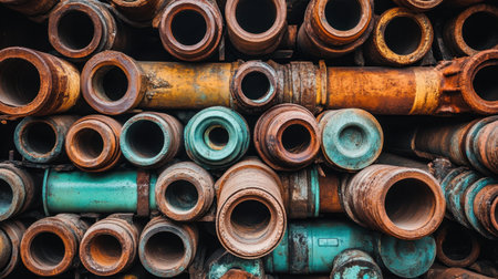 A bunch of rusty pipes that are stacked up. AI generative image.
