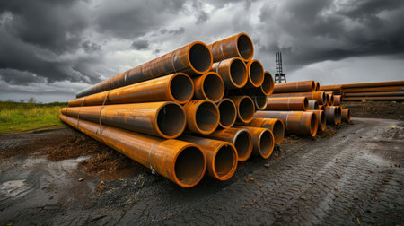 Stacked rusty steel pipes in an outdoor industrial area with a dramatic cloudy sky, showcasing the rugged and weathered nature of the materials.