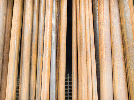 Round steel scaffold tubes stack on top of each other at laydown yard construction site, Sydney city Australia