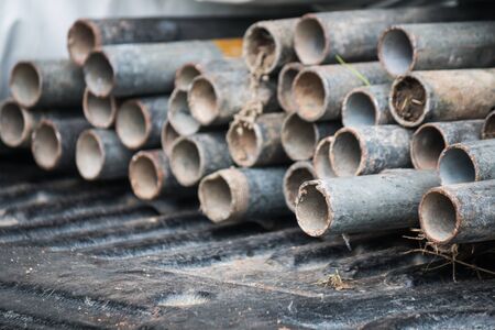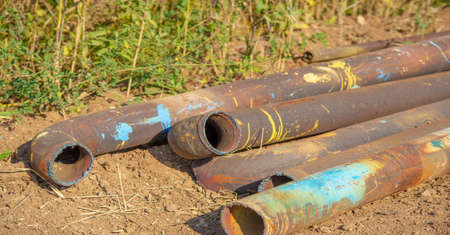 Old, rusty, dirty pipes are piled upright