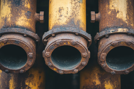 Close-up of three rusty metal pipes showcasing the effects of corrosion and weathering, highlighting the industrial environment and texture.