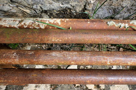 Close-up of rusty metal pipes with peeling paint, industrial decay concept