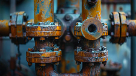 This close-up photo showcases rusted pipes with visible rust, highlighting their deteriorated condition, Detailed close-up of a corroded pipeline, AI Generated