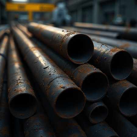 Rusty pipes of various materials lay stacked in a storage area, showing significant corrosion and age from prolonged environmental exposure.