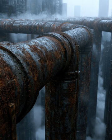 Rusted industrial pipes in a foggy urban landscape
