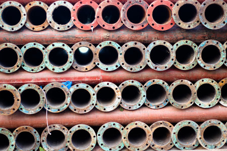 Organized pile of old iron pipes. Old dredger pipes bundle
