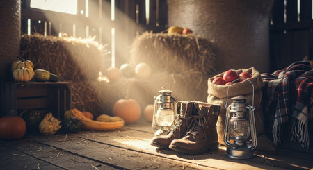 Halloween still life with pumpkins, lantern and boots on wooden background