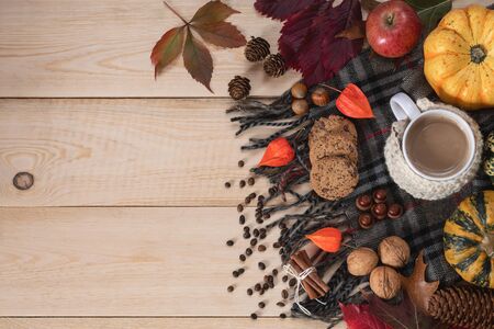 White coffee in a dressed mug with cookies on a checkered scarf with fallen leaves, nuts, apple and pumpkins on a wooden background.