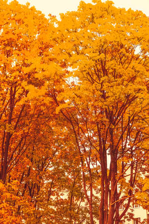 Vibrant yellow golden fresh fall tree foliage, retro toned