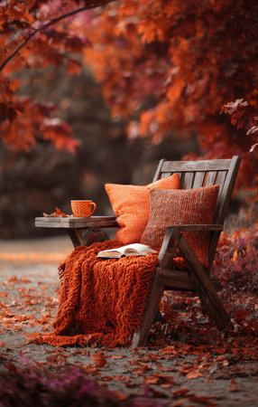 blanket with book and old retro camera on the ground in autumn public park. copy space
