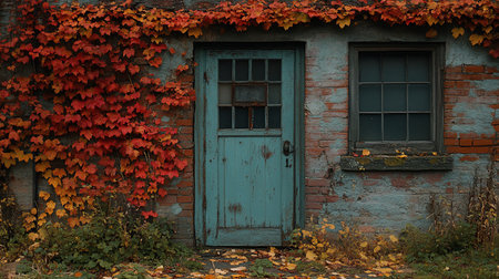 Fall front porch. autumn wreath and pumpkins on old wooden rustic background at doors. autumn composition and copy space for text