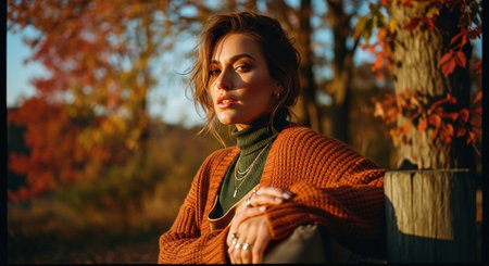 Top view of fashionable vintage style girl holding cup with coffee in autumn park, surrounded by colorful leaves