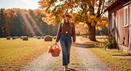 Autumn concept with pumpkins and woman in jeans and boots