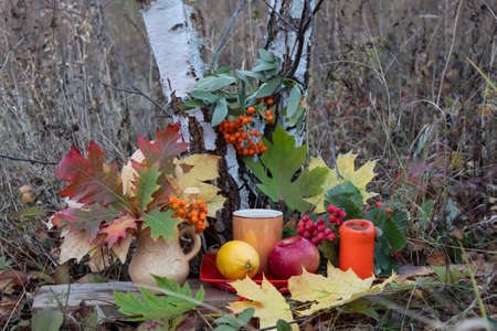 There is a cup of tea under a birch tree, an orange candle, and autumn leaves. In a clay pot there is a bouquet of autumn oak leaves and rowan berries. A lemon and an apple are on the saucer.