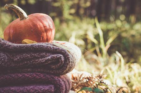 Pumpkin on folded wool jackets in a forest. Front view