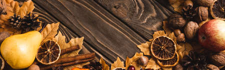 top view of autumnal harvest and foliage on brown wooden background, panoramic shot