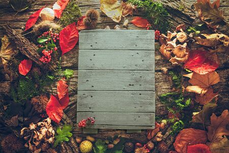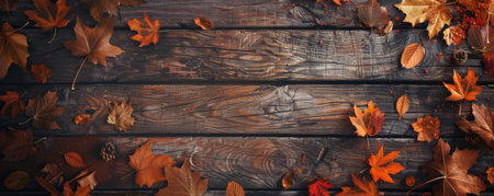 Autumn leaves and pine cones on rustic wooden background with copy space