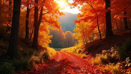 Autumn path under golden sunlight through vibrant colored trees