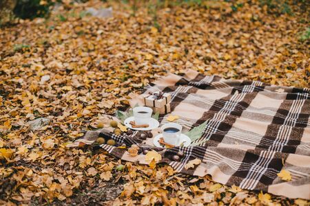 Picnic with two cups with fresh black coffee with cinnamon sticks and homemade chocolate cookies. Autumn mood