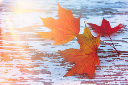 three maple leaves are yellow and red on a white painted wooden background. the concept is burning down autumn