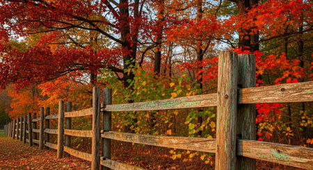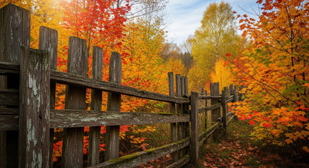 Wooden fence in the fall forest with colorful leaves and trees.