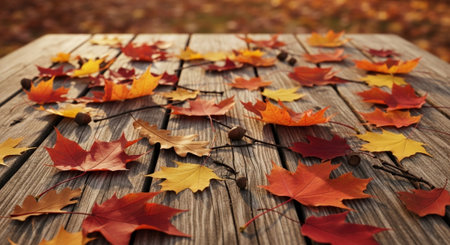 background, colorful autumn leaves and nuts lie on a wooden table. This colorful image of fallen autumn leaves is perfect for seasonal use. Place for text.