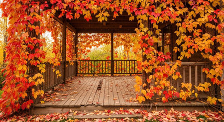 Wooden gazebo in autumn park with colorful leaves.