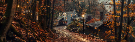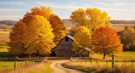 Autumn Landscape with Colorful Trees, Barn and Dirt Road