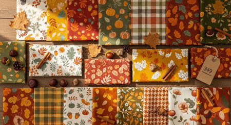 Colorful patchwork with autumnal leaves, acorns and nuts