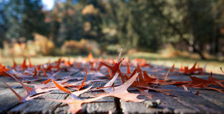 Autumn leaves on wooden table. Fall season concept. Selective focus.