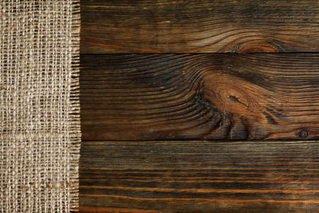 Copy space on a rustic textured wood tabletop painted with black paint and burlap of natural color on the side. Empty surface of textured wood planks and sackcloth. Top view.