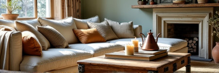 Cozy living room interior with coffee cup, book, candles and sofa
