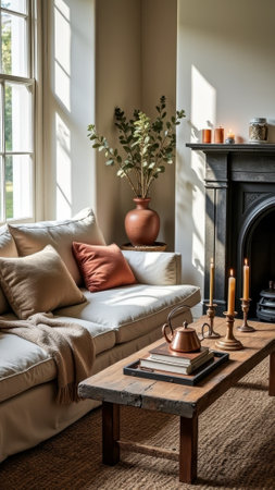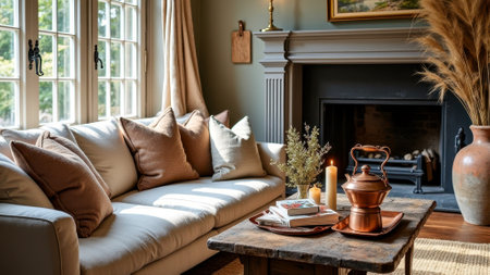 Cozy sunlit living room with beige sofa and rustic decor near fireplace. That the image is generated using AI.