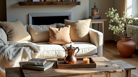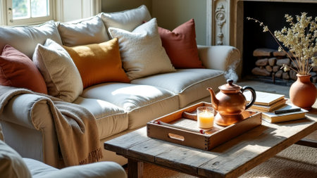 Cozy sunlit living room with warm tones, tea set, and rustic wooden coffee table. That the image is generated using AI.