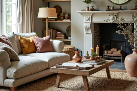 Cozy living room interior with sofa, coffee table, books, candles and fireplace.