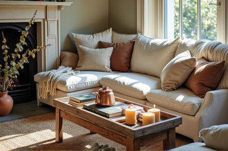 Cozy sunlit living room with white sofa and wooden coffee table accentuated by candles and books. That the image is generated using AI.