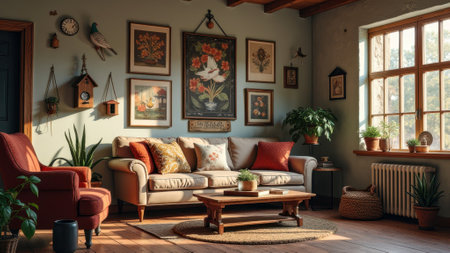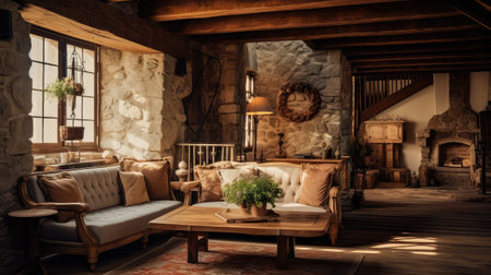 Cozy living room with sunlight, rustic decor, and comfortable seating. That the image is generated using AI.