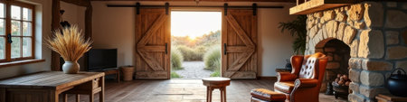 Cozy rustic living room with wooden doors and sunrise view. That the image is generated using AI.